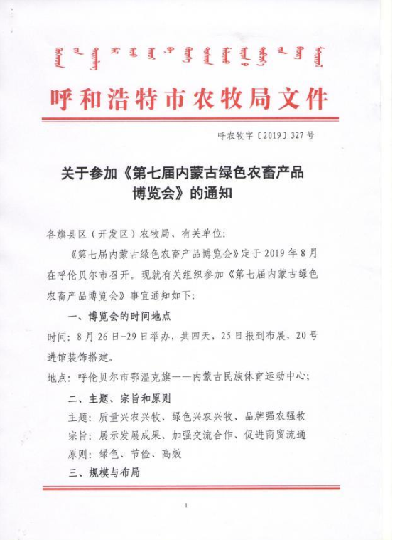 按照內蒙古自治區農牧廳《關于舉辦呼倫貝爾國際綠色發展大會暨第七屆內蒙古綠色農畜產品博覽會的通知》(內綠博組辦發〔2019〕1號)的要求,由自治區農牧廳、中國國際貿易促進委員會內蒙古自治區委員會、自治區生態環境廳和呼倫貝爾市人民政府共同主辦的呼倫貝爾國際綠色發展大會暨第七屆內蒙古綠色農畜產品博覽會(以下簡稱綠博會)于2019年8月26-29日在內蒙古民族體育運動中心(呼倫貝爾市鄂溫克旗)舉辦,其中內蒙古萬利福生物科技有限公司應邀參加本次展會,4天時間歡迎各合作伙伴前來洽談合作: