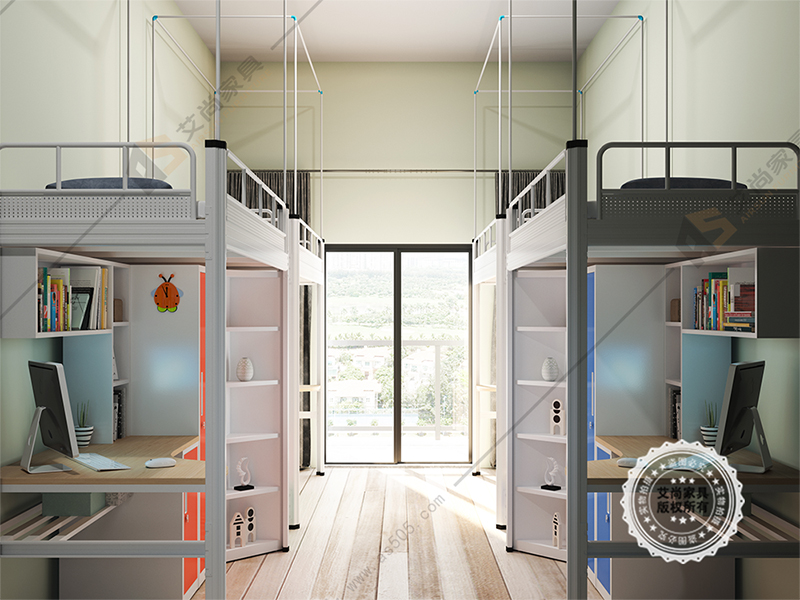 以下這款兩連體中梯公寓床是為廣州技術(shù)師范大學(xué)定制生產(chǎn)的,適用4人間宿舍,采用的顏色鮮艷、展現(xiàn)學(xué)生青春洋溢的色彩,上床護(hù)欄采用空氣式排空設(shè)計,通風(fēng)透氣, 下桌設(shè)計采用木紋板搭配橙色、藍(lán)色、藍(lán)色、粉紅色四種顏色的衣柜。