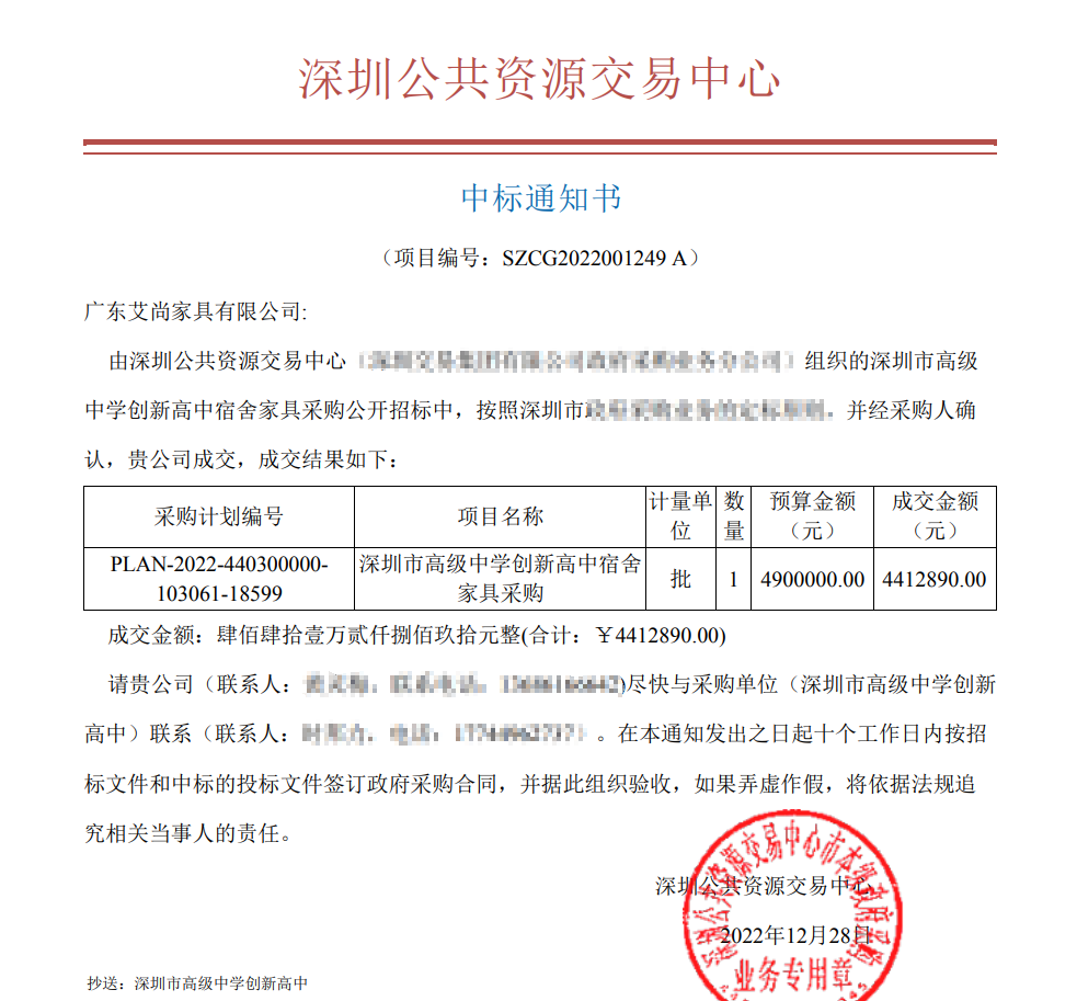 2022年底,廣東艾尚家具憑借優質的產品質量、出色的設計方案以及熟練的工程案例經驗,在眾多競爭對手中脫穎而出,成功中標創新高中、理慧高中宿舍家具采購項目,中標金額共一千多萬。