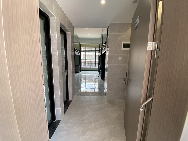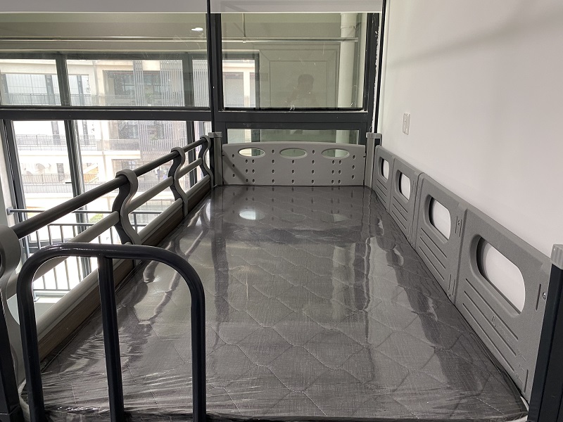 項目目前進展順利,一至三層樓正在進場安裝,宿舍房間明亮整潔,配置兩連體中梯公寓床,上有新款護欄加蚊帳桿,下有七字書桌配超大儲物柜,給員工創造獨立的私人空間。公寓床色調與宿舍裝修風格相協調,床體采用黑白灰設計,配色高雅,房間整體布局舒適溫馨。