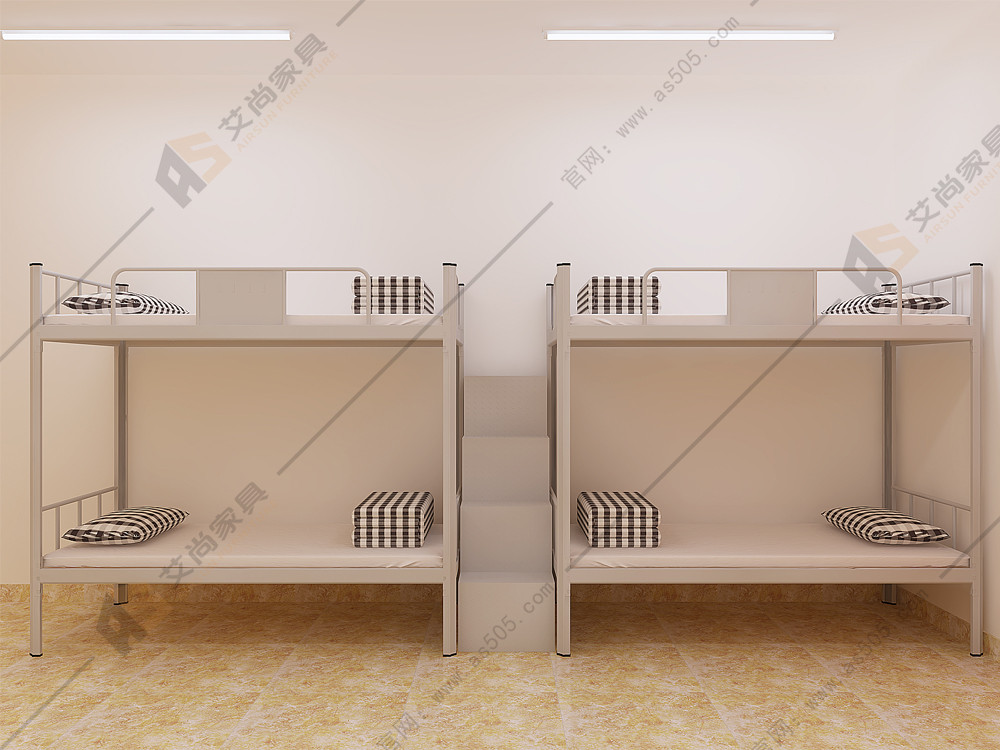這款型號為AS-G09的工廠宿舍鐵床,尺寸是2530*900*2080,艾尚家具這款工廠宿舍鐵床所用的材料是精選冷軋鋼板壓鑄而成,床架采用卡式連接,無螺絲,更重要的是它的組合方式,上面是床,下面擺放電腦臺和衣柜,旁邊有防滑踏板式樓梯,還有扶手呢,選艾尚家具這款工廠宿舍鐵床讓你的房間更整潔,更寬敞哦。