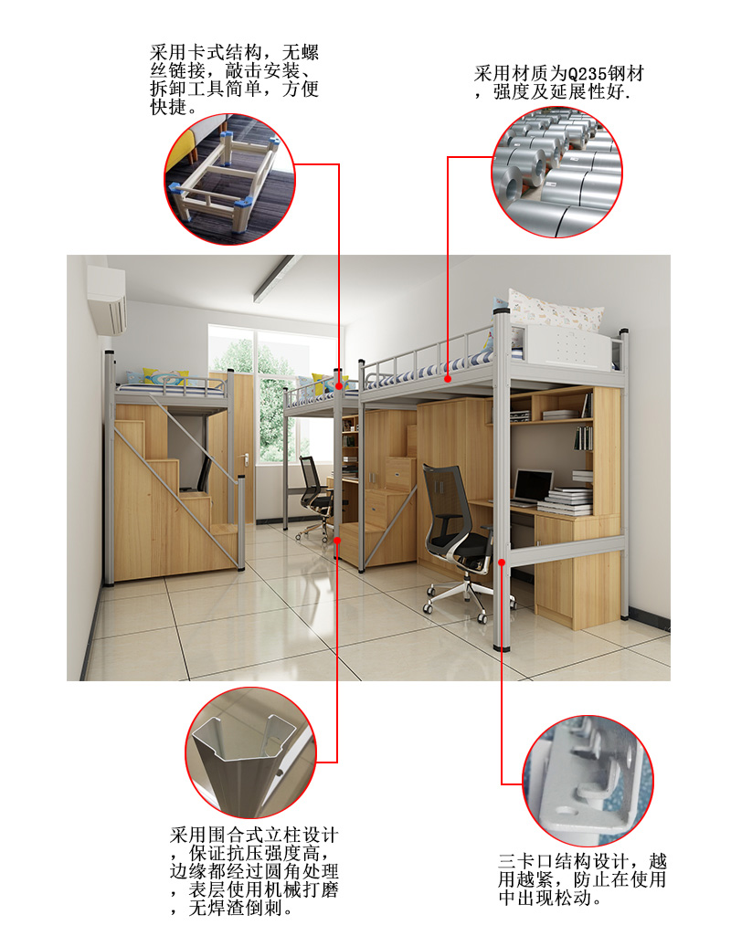 我們是廣東省東莞市較大的公寓床生產廠家之一,艾尚家具是我國中高檔公寓床批發廠商。全國專業的宿舍家具批發廠家。艾尚家具為公寓床30強企業,我們擁有8000平方的工廠面積!各省份都有經銷商。主要批發為主,客戶遍布全國學校、企業、政府,艾尚的愿景是打造五星級宿舍環境!以批發的價格銷售。公寓床表面全自動噴粉處理,0甲醛;中空異型結構,卡扣式連接、無螺絲;100%冷軋鋼板不參假。真正的良心企業!