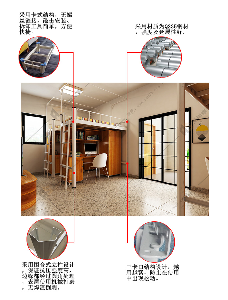 公寓床表面全自動噴粉處理,0甲醛;中空異型結構,卡扣式連接、無螺絲;