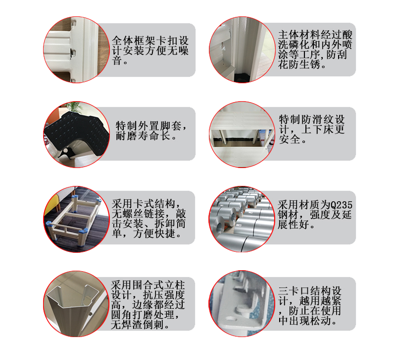 產品介紹: 兩連體體中梯雙人位中學生公寓床,產品常規尺寸4480長900寬2100高mm(可按照客戶宿舍需求定制尺寸),產品整體顏色:白色床架搭配木紋色柜子(可根據客戶喜好定制顏色),原材料采用優質冷軋鋼板經特制成型線軋制而成,其立面為中空異形,立柱正面和側面有加強筋,材料厚度為1.2mm(國標)床體承重500-1000kg!產品采用紙箱包裝減少運輸途中受損,產品主要適用于企業、工廠、學校4人間宿舍,本產品質保十年!