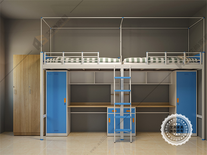 產品介紹: 兩連體側梯雙人位學生組合公寓床,常規尺寸3930長*900寬*2100高mm(尺寸可根據客戶要求定制),本產品顏色使用藍色、白色(顏色可按照客戶喜好定制),原材料使用1.2mm冷軋鋼板,產品采用紙箱包裝防止運輸途中磨損,產品適用范圍企業、單位、學校4人間宿舍均可適用。 本產品廠家質保十年!