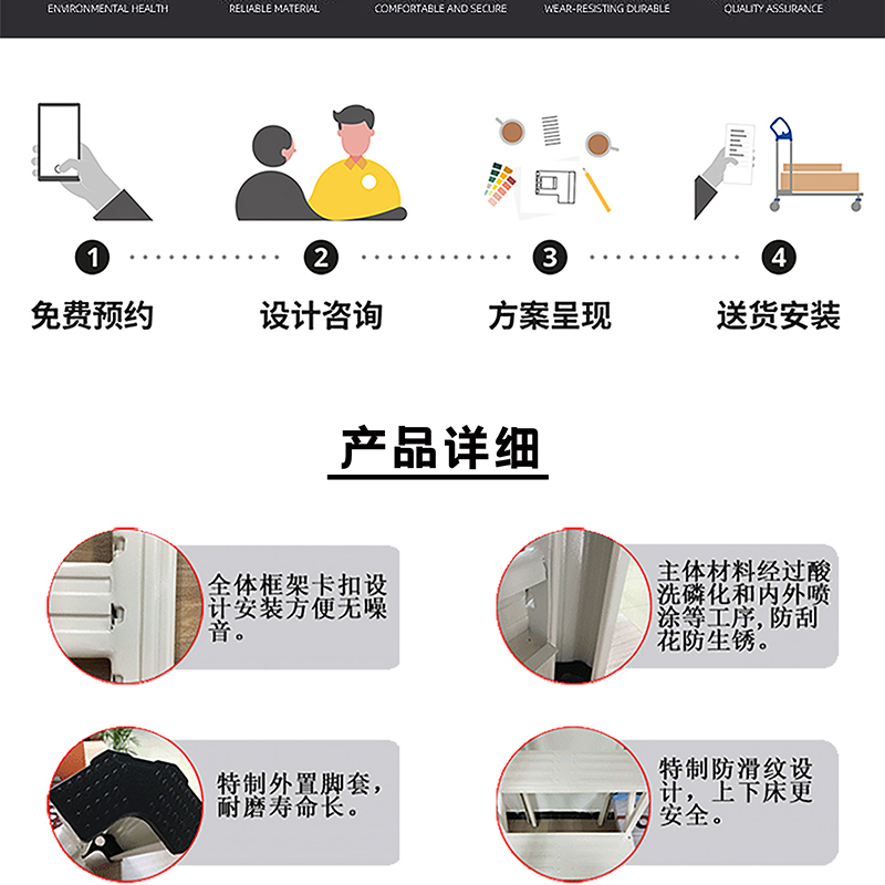 床架結(jié)構(gòu)穩(wěn)固不易變形,承重力好,床體承重力達(dá)500KG 根據(jù)人體工程學(xué)設(shè)計(jì),上下舒適自如!